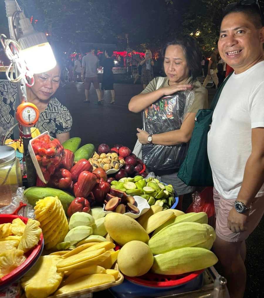 Amidst savory treasures, a detour after the meal led us to Vietnamese fruits. Exotic offerings—dragon fruit, lychee, mangoes, and coconut water—became another escapade within our shared journey, showcasing the diversity of Hanoi’s culinary landscape. This time we were standing on the streets. This time I saw CG Hisona enjoy the fruits so much.