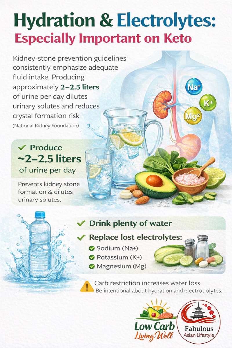 At the same time, ketogenic and very-low-carbohydrate diets increase water and electrolyte loss because glycogen depletion reduces water retention. Lower urine volume can concentrate urinary solutes, including oxalate, if hydration is inadequate