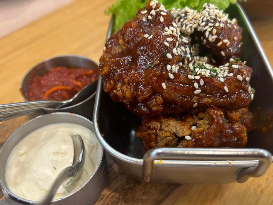 Next, we had the Korean buffalo wings. The chicken wings served with a spicy sauce, were quite hot. While I enjoy spicy food, the wings bordered on being slightly bitter. Reducing the saltiness could enhance the flavor. The heat level might be too intense for some, but spice lovers would appreciate the kick. The wings were well-cooked, with a crispy exterior and juicy interior. Overall, a good dish with room for improvement.