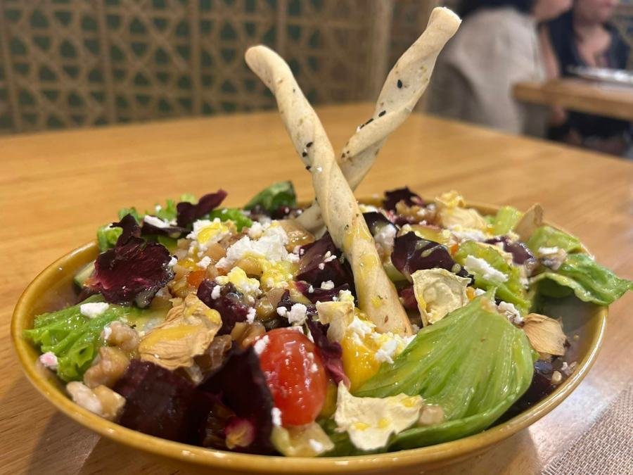 We started with the mango-beet salad, which we all loved. It included lettuce, mango slices, beet cubes, cherry tomatoes, and dried rose petals. The mango puree-based sauce added a delightful taste to the salad. The combination of fresh ingredients created a refreshing and visually appealing dish. Each bite was a perfect blend of sweet and tangy flavors. This salad set a high standard for the rest of our meal.